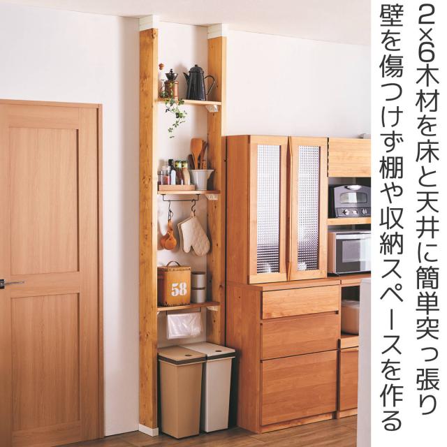 2×6木材を床と天井に突っ張り、DIYの基礎となる支柱を立てるためのアジャスターです。2×6材に本製品を取り付けて天井から床に突っ張れば柱が完成し、工具不要であっという間に壁面が収納場所へと変化します。お部屋の空きスペースや既製品の家具ではどうしてもサイズが合わなかった微妙な空間でも、木材の長さを変えるだけでピッタリのものが作れます。