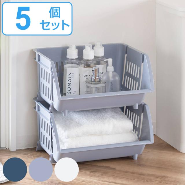収納バスケット 積み重ねバスケット 5個セット ( バスケット 収納 幅44×奥行36.5×高さ23cm 前開き プラスチック ストッカー 収納ボックス ケース 連結 スタッキング ボックス キッチン ランドリー 洗面所 収納ケース )