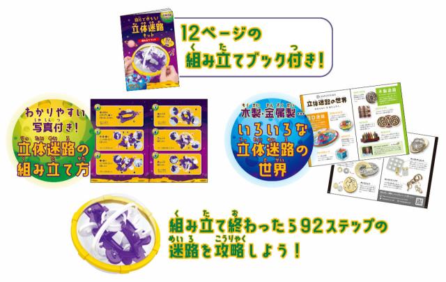 「組み立てブック」には、わかりやすい写真入りの「立体迷路の組み立て方」と、金属製や木製など様々な迷路の紹介ページ「立体迷路の世界」が載っています。