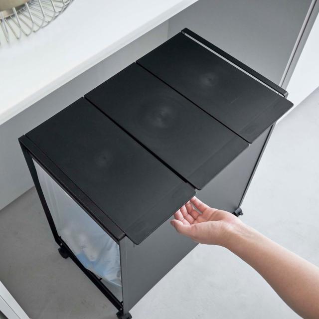 シンプルでスタイリッシュなデザイン「tower(タワー)」の3分別ダストワゴンです。正面からレジ袋が見えない目隠しプレートとふた付きなので、見た目もスッキリとした印象を与え、キッチンインテリアに馴染みます。