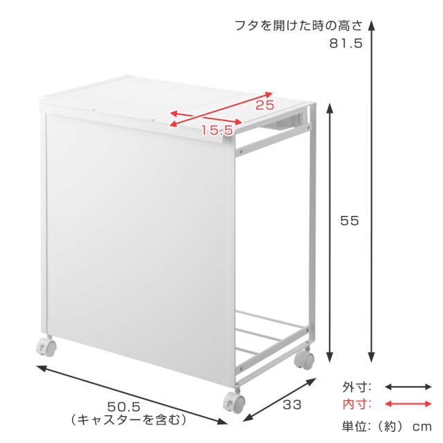 | サイズ | 約 幅50.5×奥行33×高さ55(cm) ※キャスターを含む ふたを開けた時の高さ:約 81.5(cm) 蓋開口部1つあたり:約 幅15.5×奥行25(cm) |