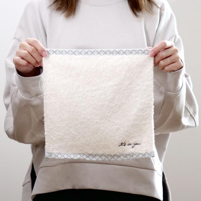 中厚でふっくらボリューム感がありふわふわの手触りです。ヘムに柄が入っているのがポイントです。持ち運びのしやすい厚みでポケットにも入れやすいです。
