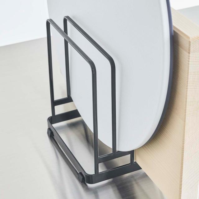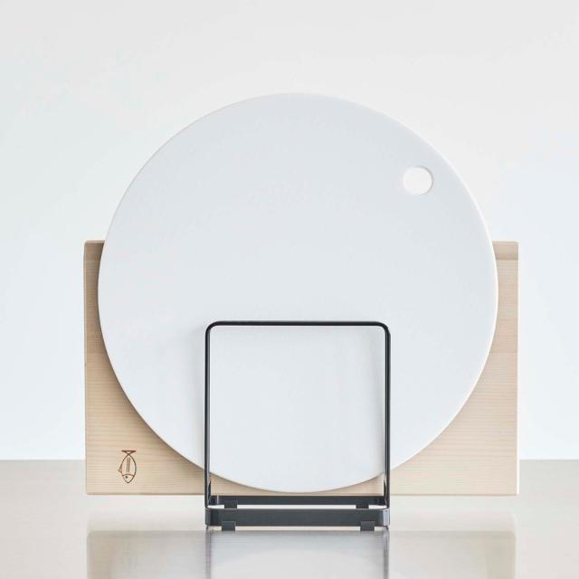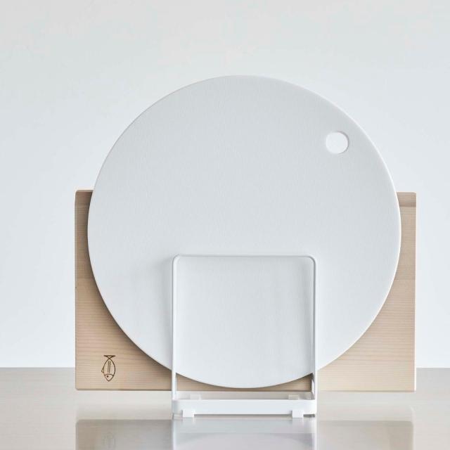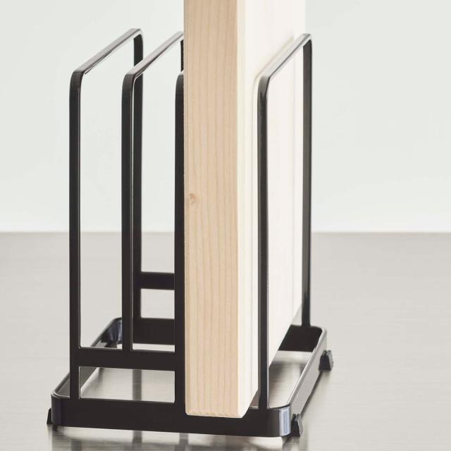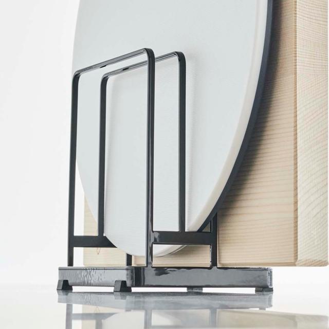 丸型のまな板と四角のまな板をまとめて収納できるまな板スタンドです。直径約18〜36cmの丸いまな板は2枚、厚みのあるまな板を1枚、最大3枚のまな板を収納できます。