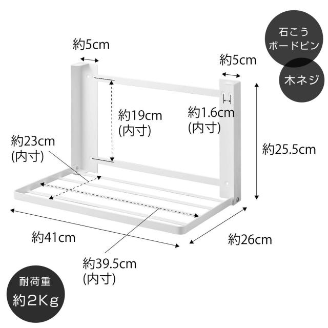 石こうボードピンで壁に取り付けられる折り畳みラックです。入浴時の着替えやバスタオルなどを一時置きでき、使わない時は折りたためる便利設計です。耐荷重は約2kgで、その日に着る服やすぐに使うタオルなどをちょっと乗せたい所に簡単に設置できます。