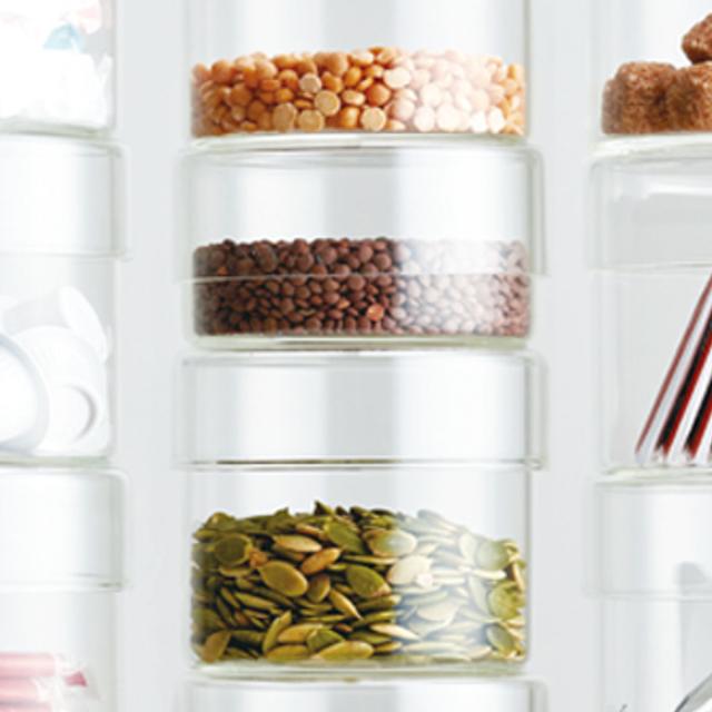 耐熱ガラス製のキャニスターは電子レンジや食洗機で使え、常備菜のストックに適しています。冷蔵庫からそのまま食卓に出しても華やか。煮卵やピクルスなどを入れても匂い移りがなく、清潔に使い続けることができます。