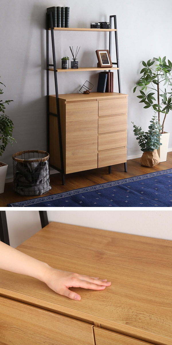ヴィンテージの風合いを生み出す、木目調の表面材とざらつきのあるブラックアイアンスチールの組み合わせです。フレーム構造なので圧迫感を感じさせず、お部屋に馴染みます。