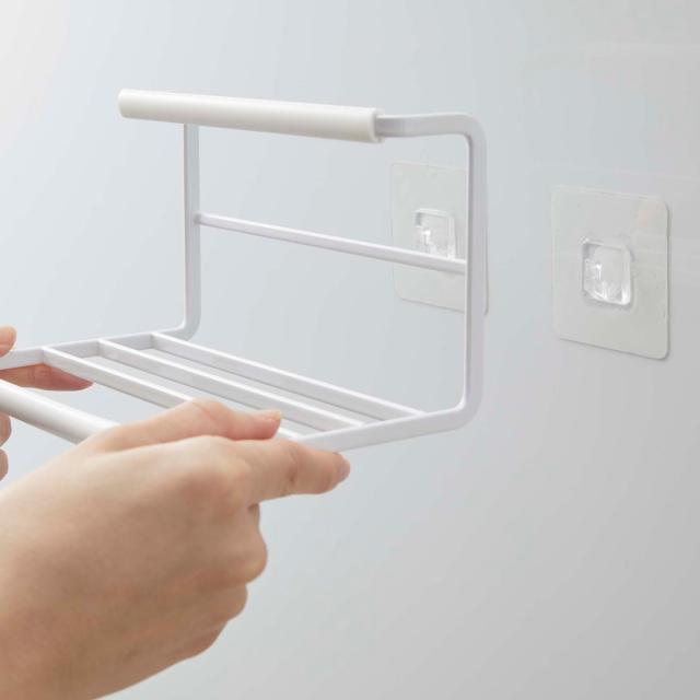 キッチンパネル、タイル、シンク中などツルっとしたした壁面に粘着力の強い「フィルムフック」を貼って取り付けて使うことができます。シンク中に設置すれば、落ちる水滴も気になりません。水切りを置くスペースがない方も壁を活用できるので、スッキリと収納できます。