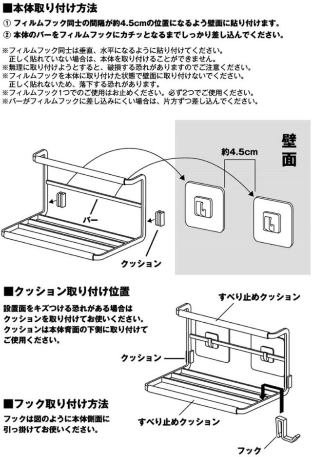 | 材質 | 本体:スチール(ユニクロメッキ+粉体塗装) すべり止めクッション:シリコーン フィルムフック:ポリカーボネート・PET・ポリウレタン |