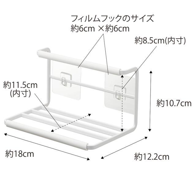| サイズ | 約 幅18×奥行12.2×高さ10.7(cm) (フィルムフック含まず) フィルムフック接着面:約6×6cm(1つあたり) 内寸(ラック部):約 幅18×奥行11.5×高さ8.5(cm) |