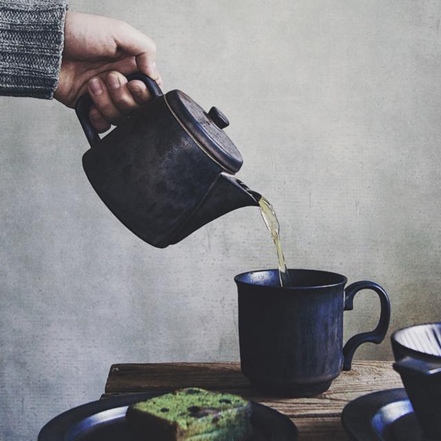 銅の青サビのような素敵な風合いの青みがかったグレー。茶色と青と白が混ざり合い窯変して表れる微妙な色合いは、二つと同じ物がなく、器の表面に素敵な景色を描いています。クールなイメージのテーブルコーディネートにはぴったりの器です。