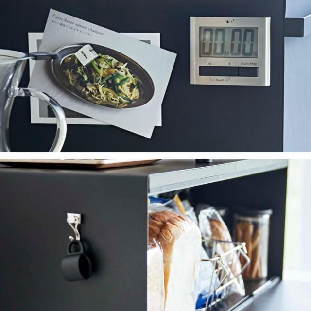 マグネットの付くスチール製なのでキッチンタイマーやレシピ、コーヒーメジャースプーンなどの小物を掛けたりサイドも無駄なく使えます。
