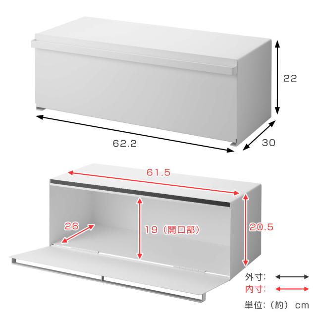 | サイズ | 外寸:約 幅62.2×奥行30×高さ22(cm) 内寸:約 幅61.5×奥行26×高さ20.5(cm) 本体:開口部:19cm 本体上部:約幅62×奥行27.5cm 取っ手:各約幅30.5×奥行2cm |