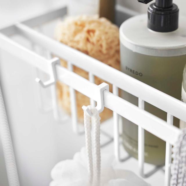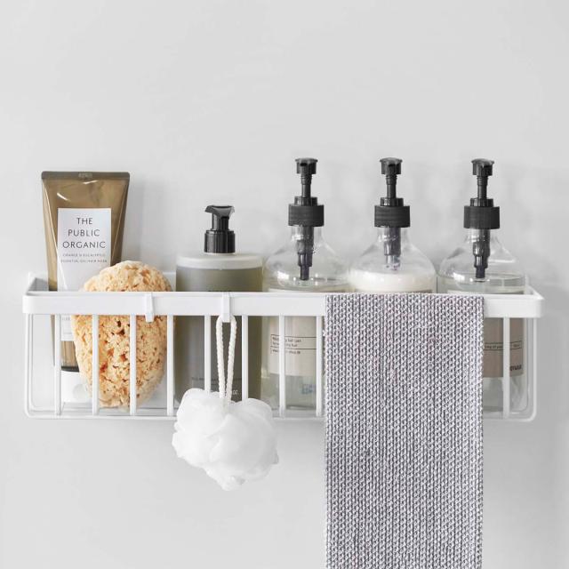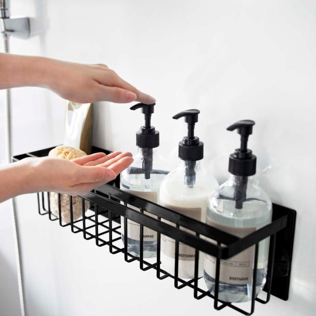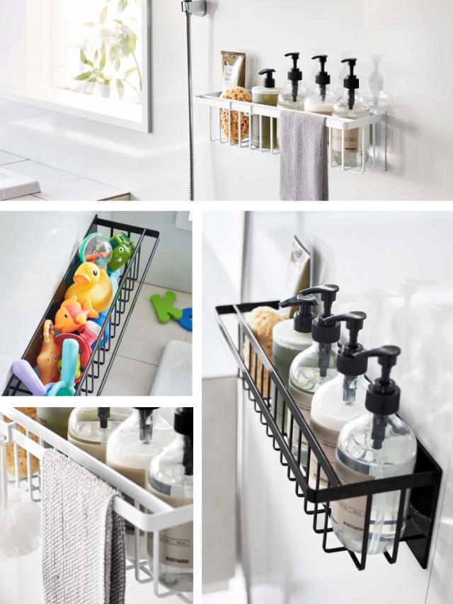 マグネットの付く壁面に簡単に取り付けできるバスケットです。ディスペンサーやチューブなどを並べて収納でき、手前のバーにはタオルなどを掛けることができます。シンプルですっきりとしたデザインは、まるで備え付けのようにバスルームに馴染みます。
