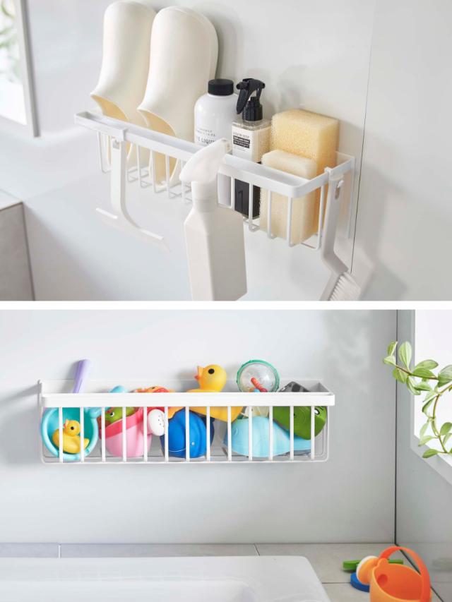 水切りワイパーやバスブーツなどの掃除道具を収納すると、サッと手に取りやすく便利です。片付けに困るお子さまのおふろ用おもちゃも、ポイっと入れるだけでOKでお片付けも簡単です。