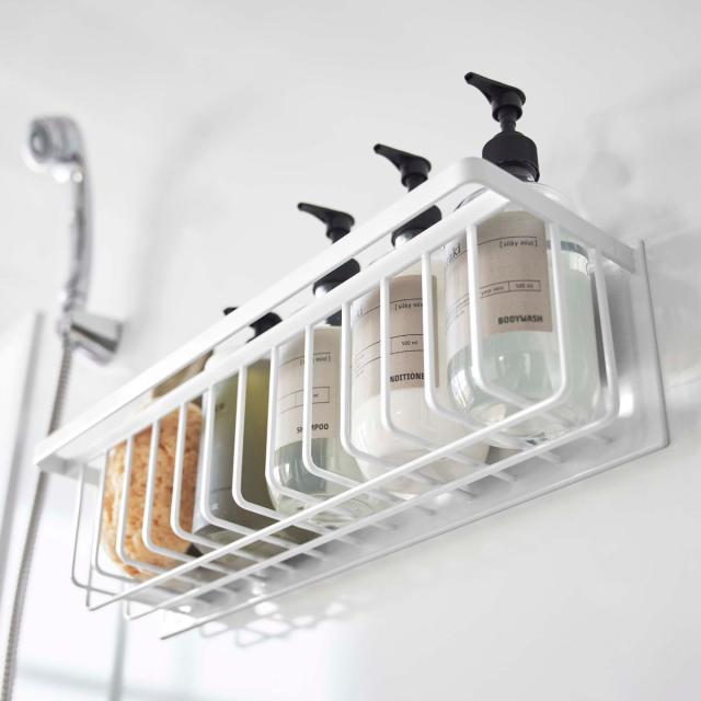 ●ディスペンサーボトル・チューブを並べて収納できる奥行がスリムなワイドバスケットです。