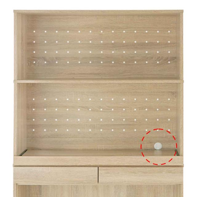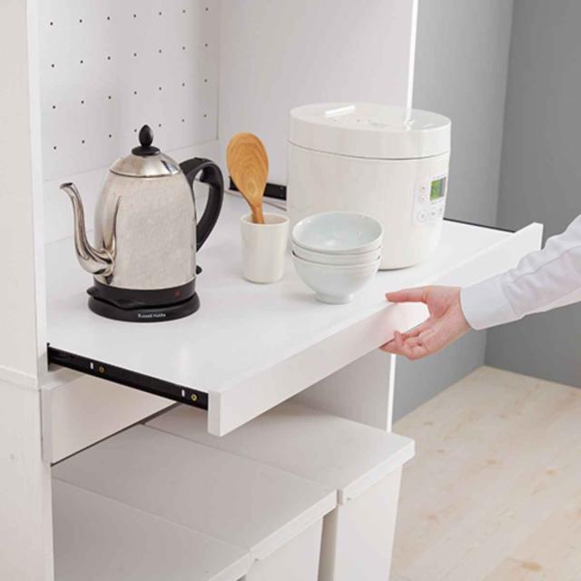 家電などが置けるスライド棚です。炊飯器や電子ケトルなどの蒸気の出る家電も、棚を引き出して蒸気を逃しながら使うことができます。
