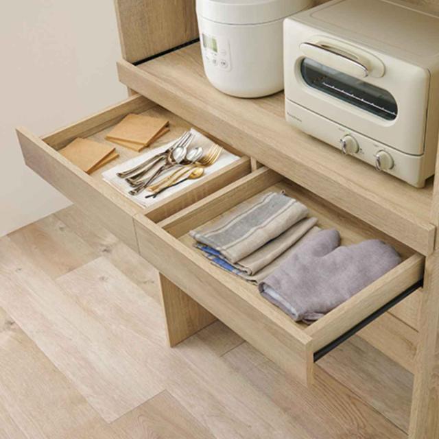 深さ4cmの引出しが2つ付いており、食器やナイロン袋、ふきんなどすぐに取り出したい物のを入れるのにぴったりです。引出しはスライドレール式なので、軽い力でサッと引き出すことができます。