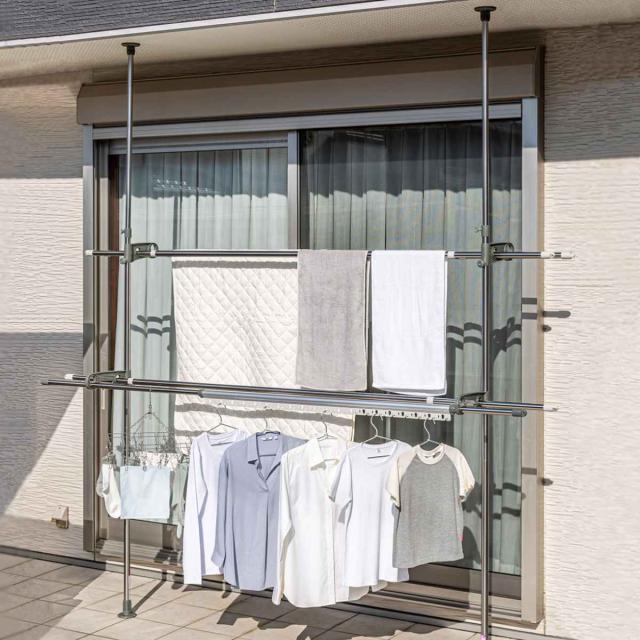 物干し 室外 ベランダ用突っ張り物干し 2段 ( ポール 突っ張り 洗濯 洗濯物干し ベランダ用 衣類 スタンドポール ダブルバー ステンレス ハンガーラック 屋外 二段 )