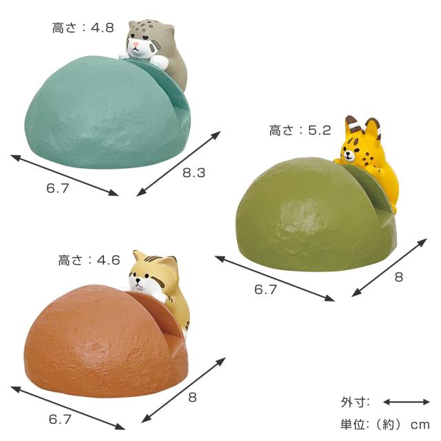 | サイズ | マヌルネコ:約 幅6.7×奥行8.3×高さ4.8(cm) サーバル:約 幅6.7×奥行8×高さ5.2(cm) スナネコ:約 幅6.7×奥行8×高さ4.6(cm) 溝の幅:約1.5cm |