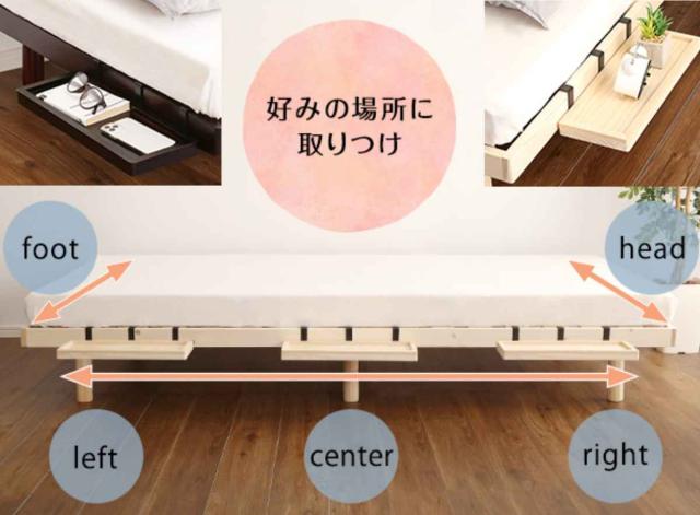 ベッドの横にちょっと物を置きたい時に便利な簡易宮棚付きです。好みの場所に取り付けできるので、眠る時や目覚める時、一番便利な場所でサッと物を取ることができます。周囲にフチがあるので、物が落ちにくく安心してお使いいただけます。