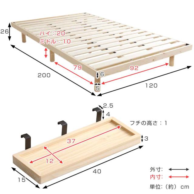 | サイズ | ベッド:約 幅120×奥行200×高さ26(cm) 床面高:6/16/26cm 簡易宮:約 幅40×奥行15×高さ7(cm) |