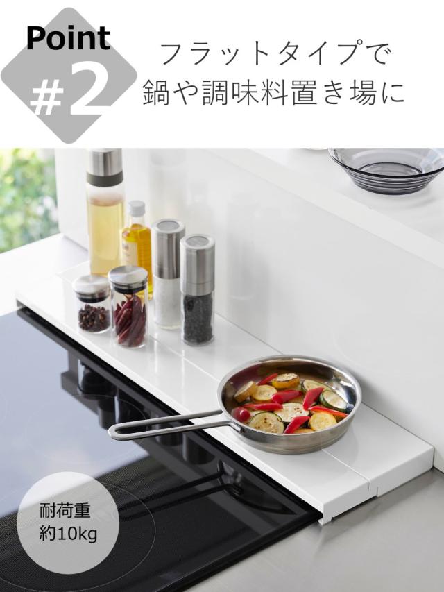 よく使う調味料やお料理中のフライパンやお鍋の一時置きにも便利です。今まで使えてなかった排気口周りやコンロ奥のデッドスペースを有効活用することで、収納スペースが広がるだけでなく、作業効率もアップします。
