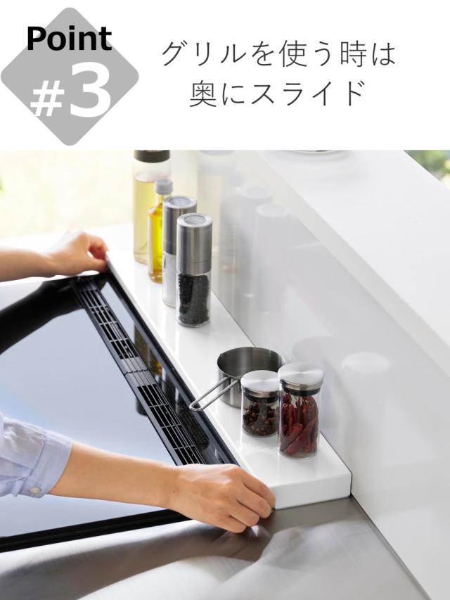 グリルを使用する時は、サッと奥側にスライドさせるだけです。奥側に置いた調味料などは動かさなくていいので、手間もかからず、いつでも気軽に排気口をオープンにできます。