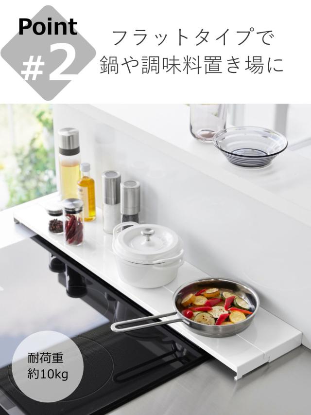よく使う調味料やお料理中のフライパンやお鍋の一時置きにも便利です。今まで使えてなかった排気口周りやコンロ奥のデッドスペースを有効活用することで、収納スペースが広がるだけでなく、作業効率もアップします。