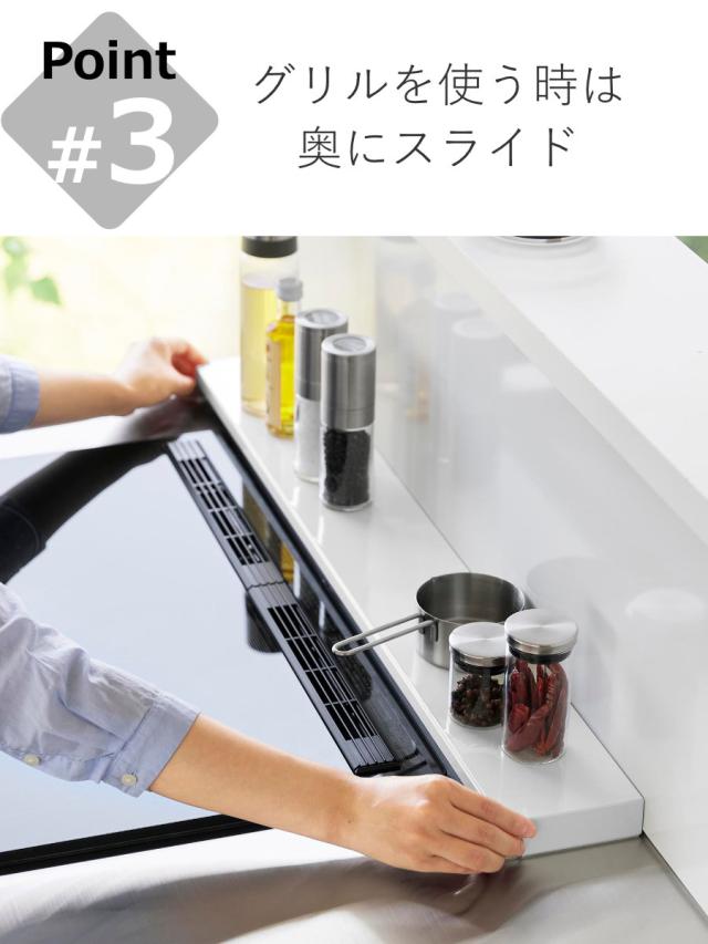 グリルを使用する時は、サッと奥側にスライドさせるだけです。奥側に置いた調味料などは動かさなくていいので、手間もかからず、いつでも気軽に排気口をオープンにできます。