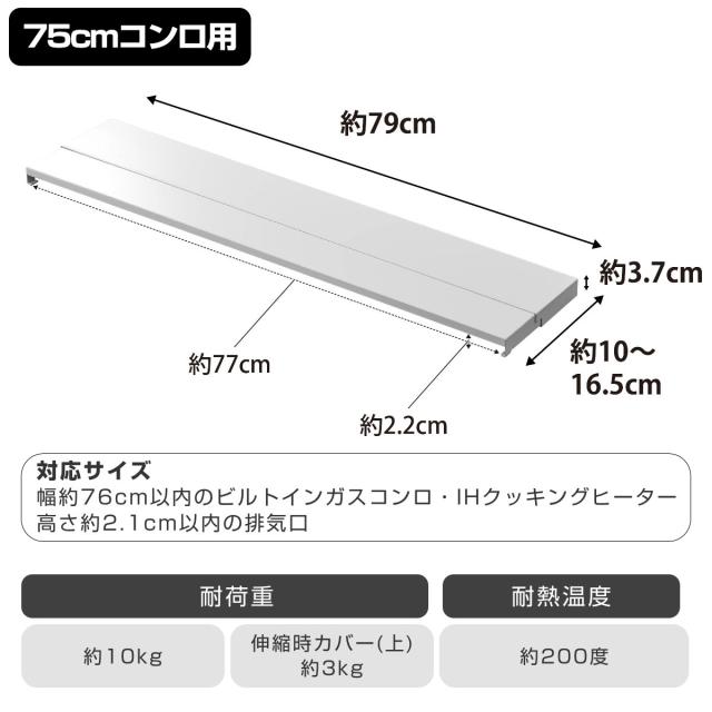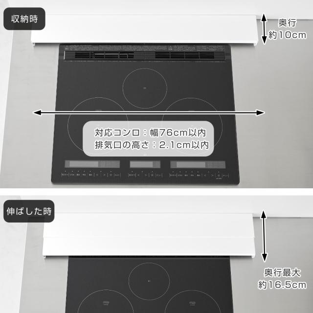 | 備考 | 対応サイズ:幅約76cm以内のビルトインガスコンロ・IHクッキングヒーター、高さ約2.1cm以内の排気口 |