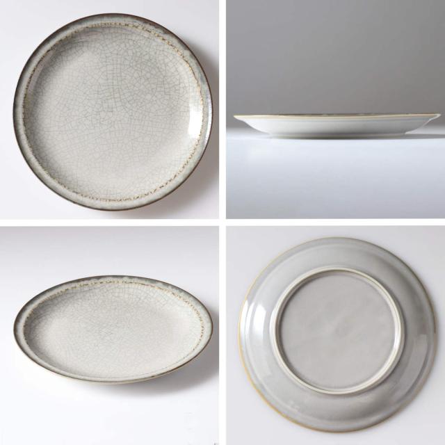 艶のある釉薬を使用し、つるつるとした質感です。リム部分にはデザインがほどこされ、盛り付けたお料理を引き立てます。見込み部分の複雑に入った模様はひとつひとつ表情が異なり、いつもの何気ないお料理も特別に感じさせてくれそうです。