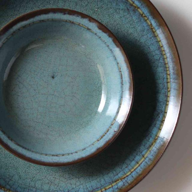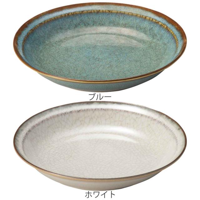 艶のある釉薬を使用し、つるつるとした質感です。リム部分にはデザインがほどこされ、盛り付けたお料理を引き立てます。見込み部分の複雑に入った模様はひとつひとつ表情が異なり、いつもの何気ないお料理も特別に感じさせてくれそうです。