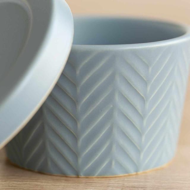 さりげないヘリンボーン柄が上品な、ふた付きココットです。お料理が引き立つシンプルなデザインと、ベーシックな色味でどんな食卓にも馴染みやすいです。気取り過ぎない素朴なテイストが、ほっこりとした雰囲気の空間を演出します。
