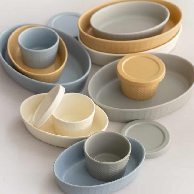 優しいカラーでテーブルを素敵にコーディネートする「ヘリンボーン」シリーズです。オーブン、直火、魚焼きグリル、電子レンジにも対応しているので様々な用途にお使いいただけます。器ごとに表情が異なる陶器製特有の魅力があり、様々な料理を引き立てます。