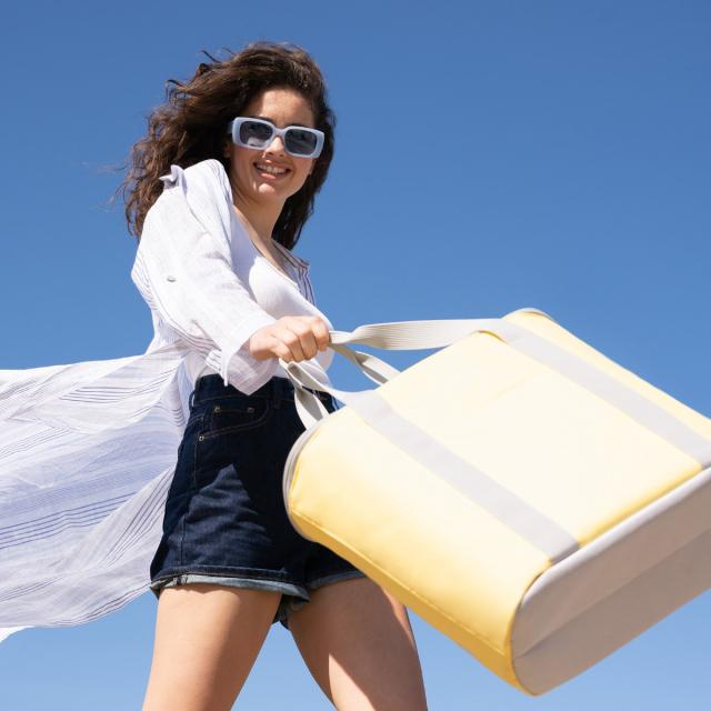 毎日のお買い物やレジャーにも使える保温保冷機能付きのサーモバッグです。開口部が大きく開くので使いやすく、ボトルを立てて入れることができるデザインになっています。