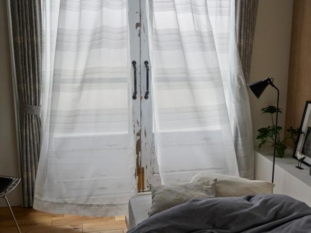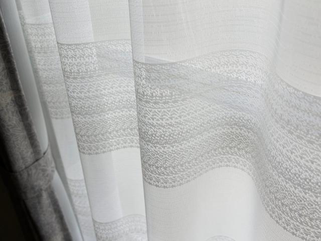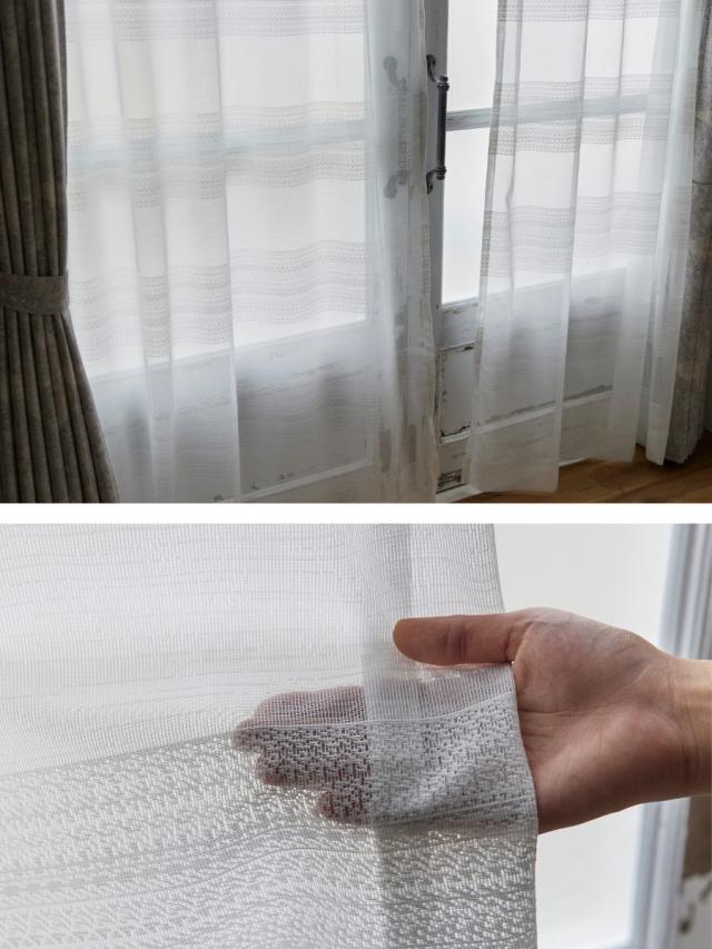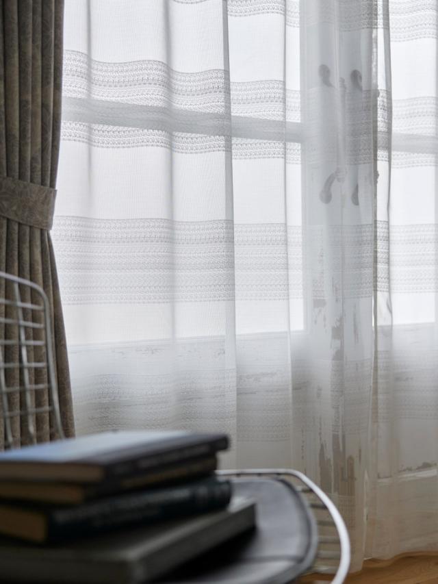 レースのような繊細な意匠の大胆なボーダー柄のカーテン