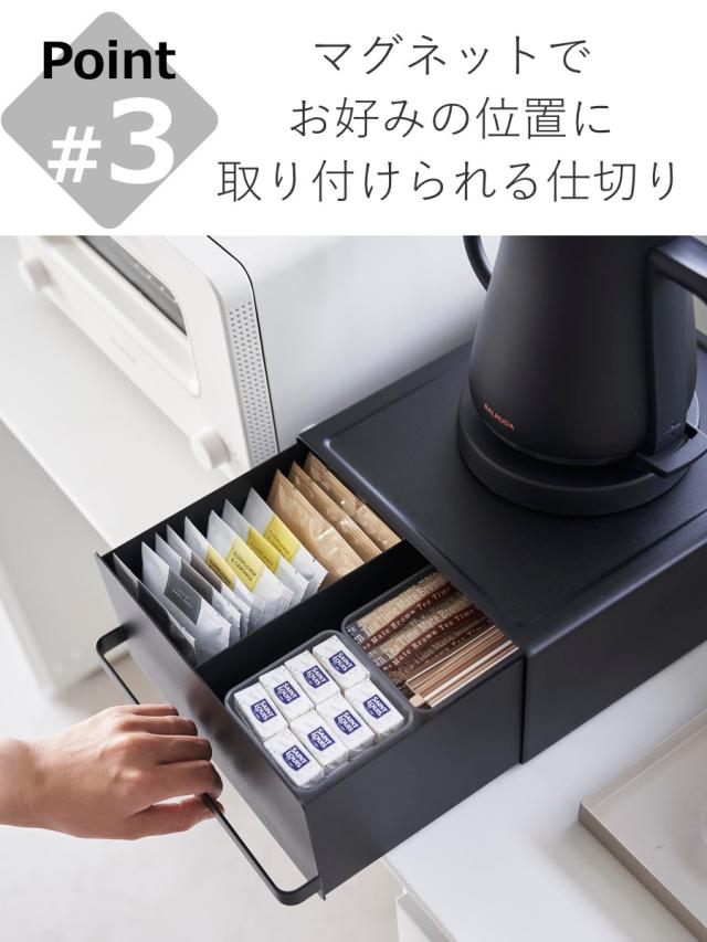 マグネットでお好みの位置に取り付けられる仕切り付きです。引き出しの中にシュガーや紅茶パックなどを一括収納できます。