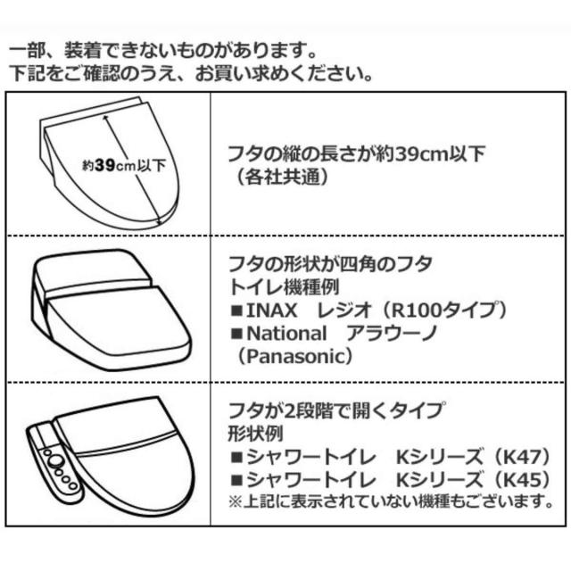 洗浄・暖房型、U・O型、どのタイプのフタにもぴったりフィットします。粘着タイプなので、裏面に縫製された粘着シートを貼り付けるだけで、どなたでも簡単に装着できます。