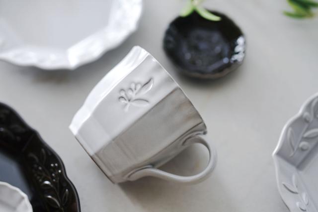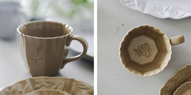 クラシカルなフォルムにオリーヴのレリーフが美しいマグカップです。内側の底を含む3か所にオリーブが描かれているので、コーヒーを飲み終えた後も気持ちが和みます。