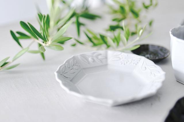 クラシカルなフォルムにオリーヴのレリーフが美しいプレートです。取り分け皿やケーキ皿にお使いいただける使い勝手のいいサイズです。食器としてだけでなく、小物いれやそのまま置いておくだけでもさまになるデザインです。