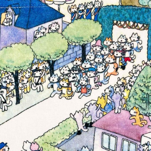 たくさんの人に長く親しまれている人気絵本「11ぴきのねこマラソン大会」のデザインのハンドタオルです。シャーリング生地で柔らかくすべすべとした肌触りです。かばんに入れやすく持ち運びにピッタリなサイズで、濡れた手もしっかりと拭くことができます。