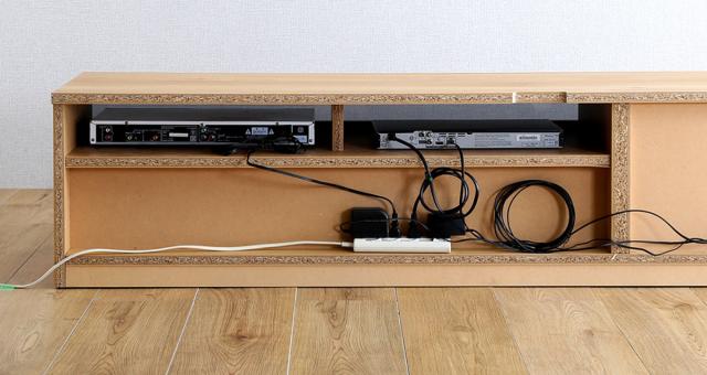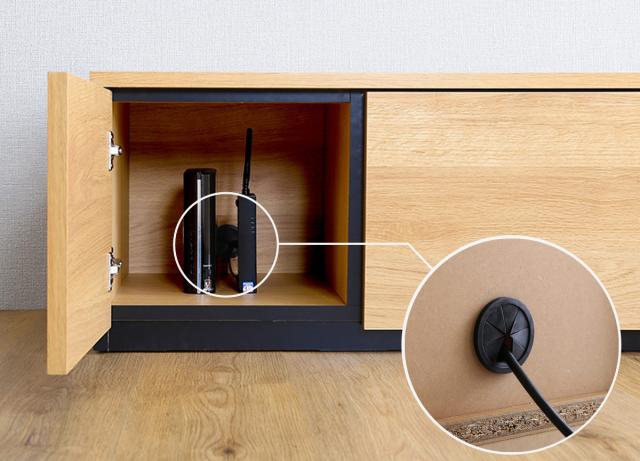 無線LANのルーターや、ゲーム機本体の設置にちょうど良い扉収納。背面にコードを逃がせるコード穴は、ホコリ除けのカバー付きで安心です。