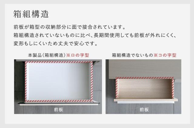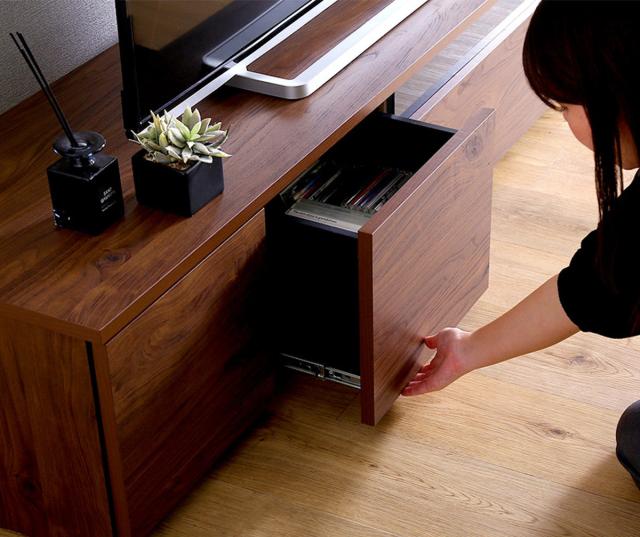 引出し収納には、CDやDVDを大容量収納することができます。大量に収納してもなめらかに開閉できるスライドレールで、収納物の重みで変形しないよう、本体の幕板部分を引出しの外側まで伸ばしています。