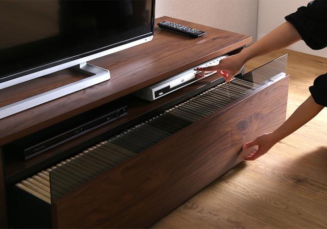 引出しを開けると現れるオープン収納には、レコーダーやAV機器を設置するのにぴったりです。引出しを閉じた時にもガラス窓の透け感が美しく見えるように、木口を黒く塗装しています。