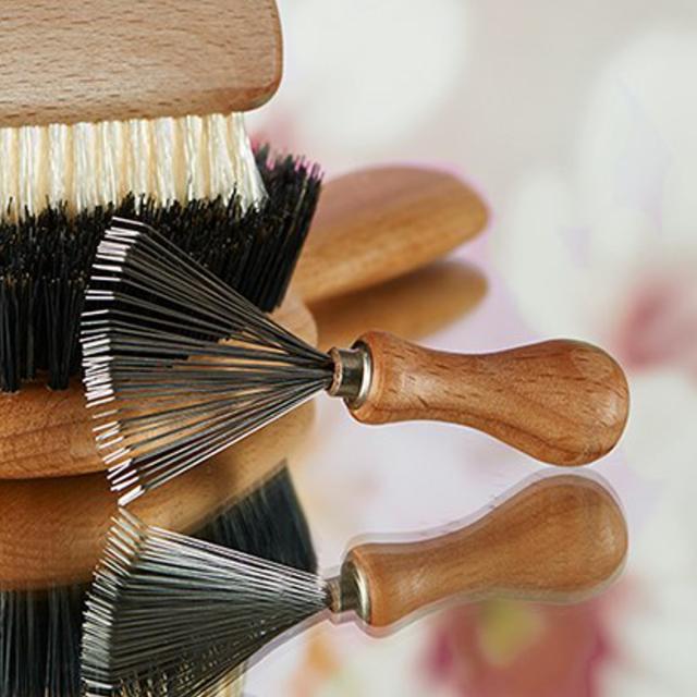 柄の部分には、ナチュラルで手に馴染む、天然木を使用しています。持ちやすく触り心地が良いので、ブラシのお手入れを楽しく行えます。