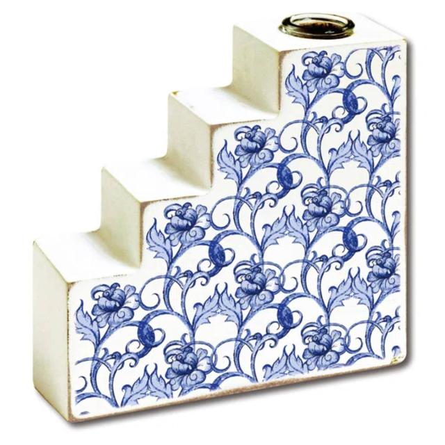 木製のベースに鮮やかな色彩と繊細な模様を施したフラワーベースです。