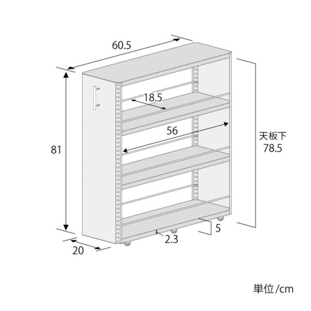 | サイズ | 本体(取っ手含まず):約 幅20×奥行60.5×高さ81(cm) 棚板:約 幅19.5×奥行60×高さ2.3(cm) |