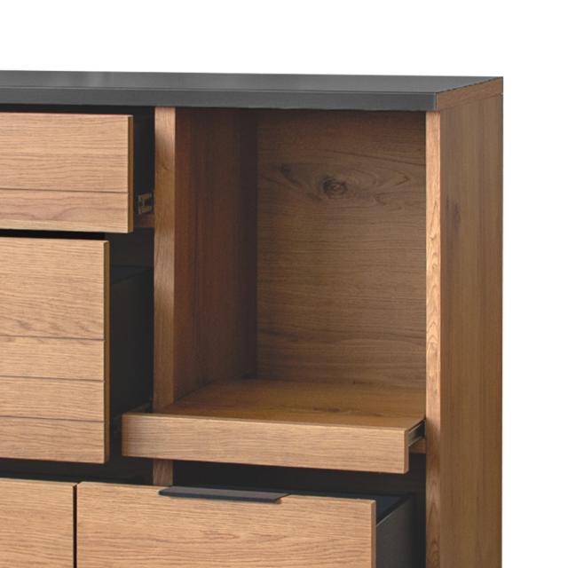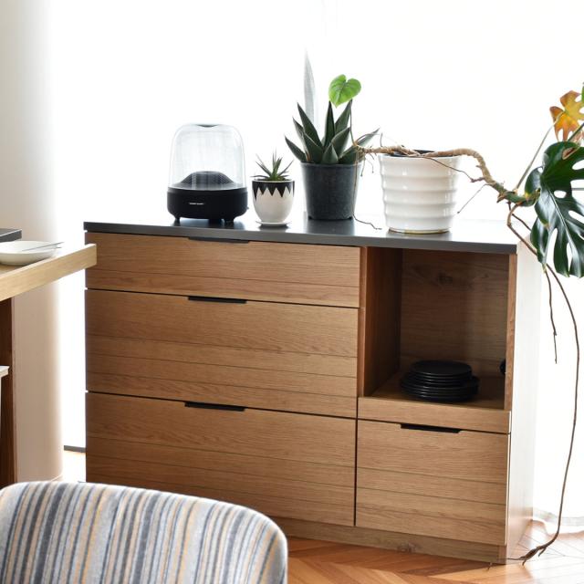 引出しはフルスライドレール仕様でスムーズな開閉ができ、奥まで見渡せます。深さの違う引出しで整理しやすく、たっぷりと収納することができます。取っ手はスタイリッシュで主張しないデザインで、さりげなくアクセントに。