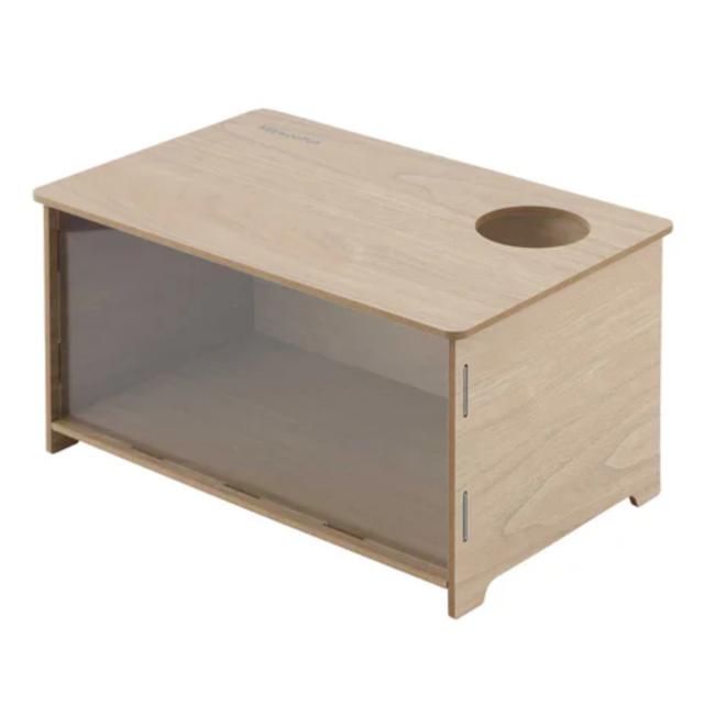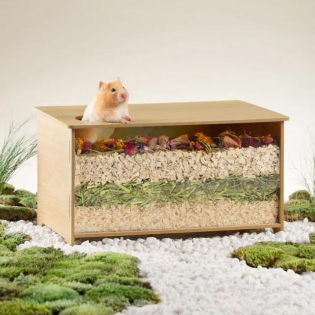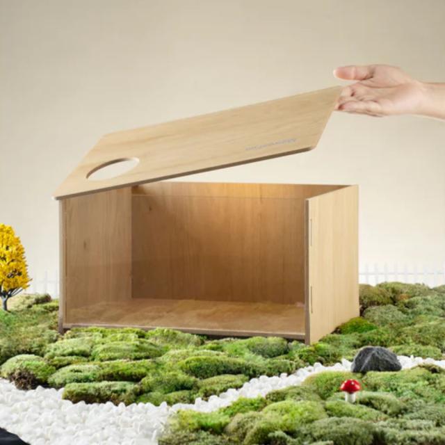 前面の大きな窓からは中がよく見えます。ハウス内に葉や木のチップを敷けば、快適で居心地の良いダイニングルームができあがります。上部には出入り口があり、かわいいペットが出入りする姿を観察できます。