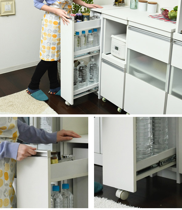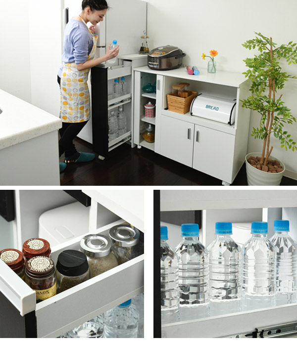 スリムな見た目ながらも、ペットボトルなどが大量に入るよう計算して作られています。キッチンのちょっとした隙間に設置すれば、それまでのデッドスペースを有効活用できます。